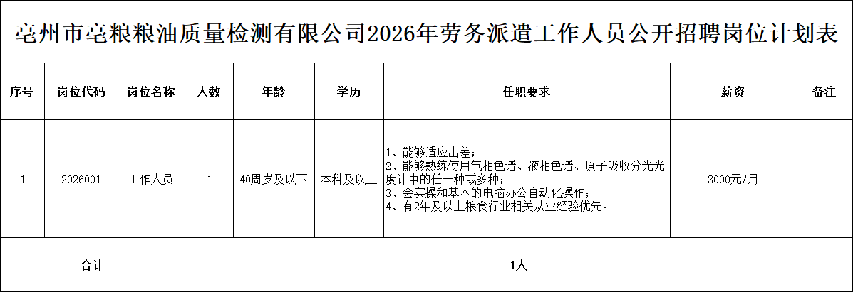 受亳州市亳粮粮油质量检测有限公司委托,亳州市谯腾人力资源管理有限公司现面向社会公开招聘劳务派遣工作人员1名,具体事宜公告如下: